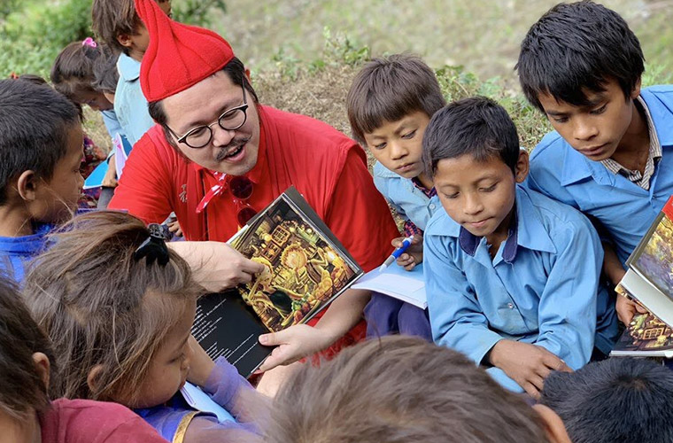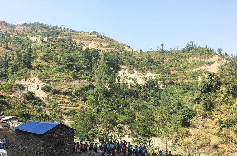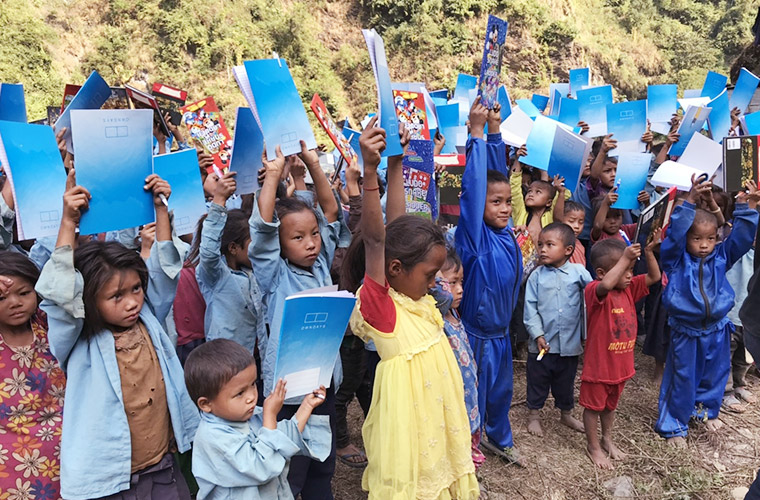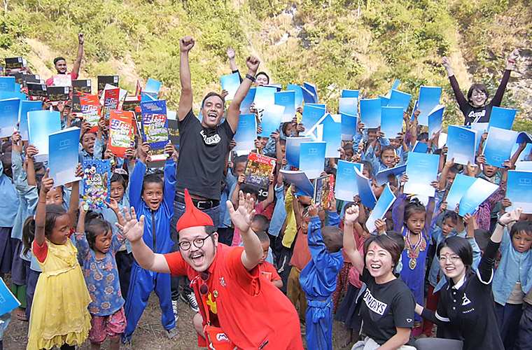 さらに険しい山道を車で進み、到着したのは山間部にあるティタリタルの小学校。ここで勉強する子供たちに文房具とおもちゃ、西野亮廣さんの絵本『えんとつ町のプペル』を配布しました。