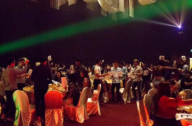 来場したスタッフたちには、あらかじめアルファベットが書かれた紙がランダムに配布されています。読み上げられたキーワードを、周りの人と協力してより早く完成させることができたグループに景品がプレゼントされます。