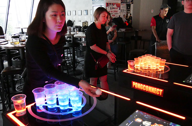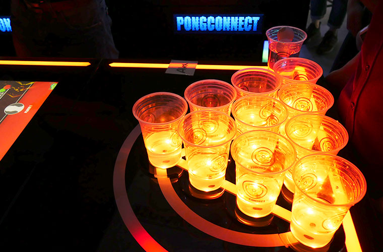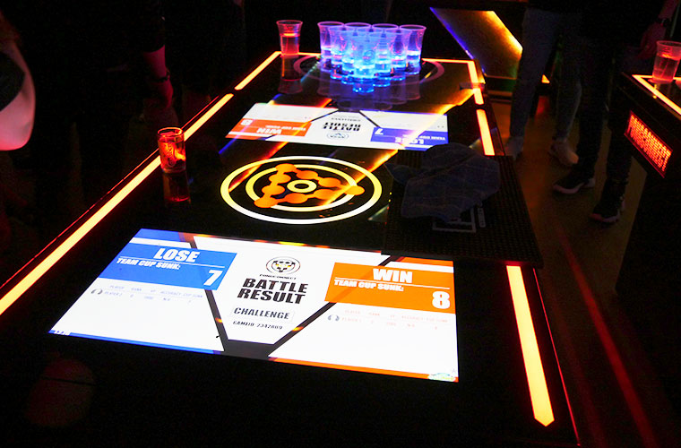 8 team leaders were randomly picked and they had to find 2 members each to form a team of 3 for the beer pong tournament. Beer pong is a popular drinking game in which a player stands at one end of a long table and throw a ping pong ball into cups placed at the other end of the table. There are typically 10 cups placed in the triangle formation. A cup is removed from the formation when a ball lands inside. The goal is to remove as many cups from the formation as possible.