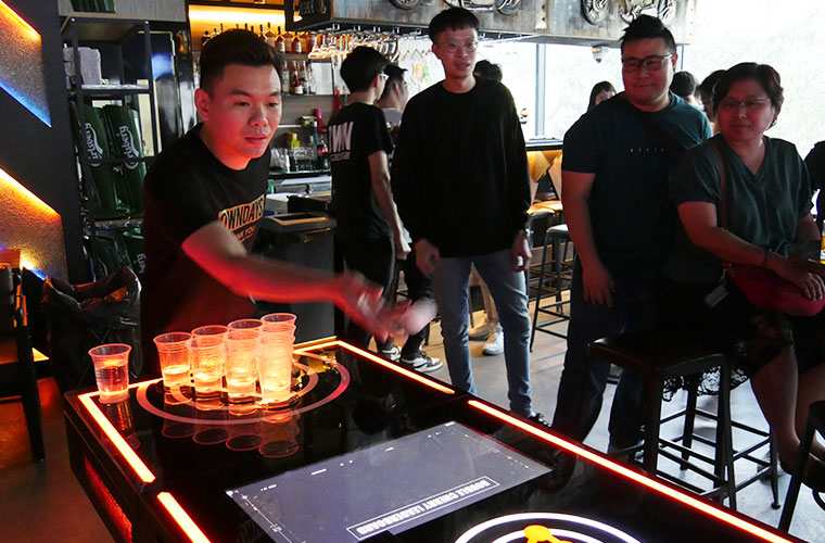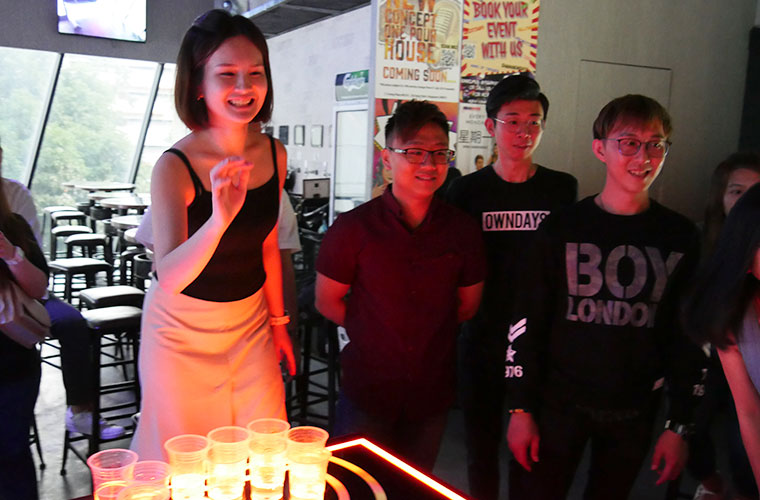 Everyone gathered around the two beer pong tables as the 8 teams battled it out in the knockout tournament. It was great fun watching the players try their best to aim and toss the ping pong ball into the cups. The final round was especially intense with the opposing teams coming very close on their scores. Eventually, it was the office team consisting of Ronald, Admond and Canny who emerged victorious, bagging the prize of 50,000 miles. Well done!