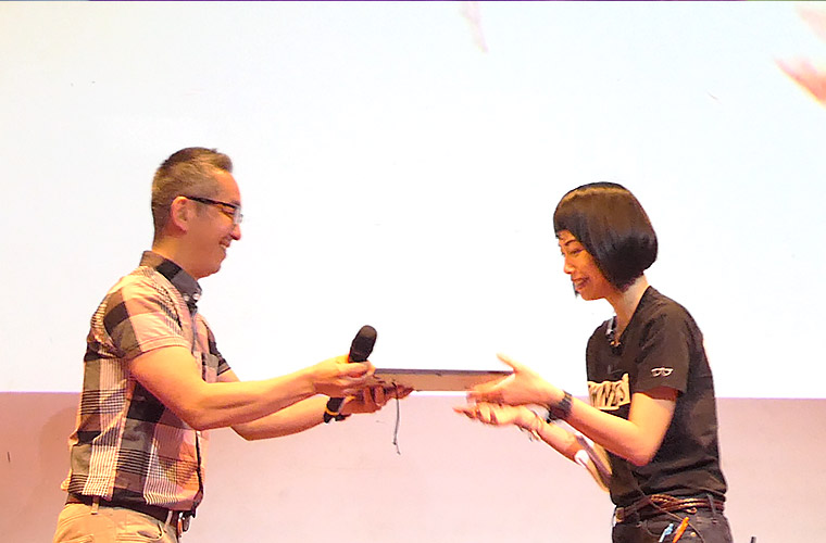 念到名字後站上舞台,始終露出不可思議表情的她,驚訝到說不出話。由General Manager小松原徳郎頒發獎狀,會場也給予她肯定的掌聲。