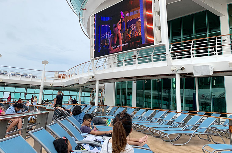 We returned on board after lunch and relaxed by the poolside where we watched a movie from a giant outdoor screen as the cruise sailed towards the next destination, Phuket. After a heavy buffet dinner at the Windjammer restaurant, we joined in the fun with the other guests at a pool party. There was a DJ spinning club anthems as well as a performance from the bartenders. The crew then taught us how to dance to the party music and it was great fun! The party ended with a live band performance. What a wild night!